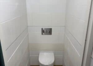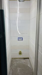 Ook zijn de installaties op het dak geplaatst zoals de luchtbehandelingskasten en warmtepompen. En is er alvast een proefopstelling gemaakt voor het plafond en tegelwerk in de toiletten.