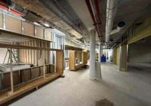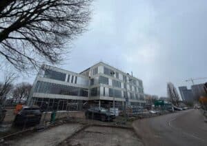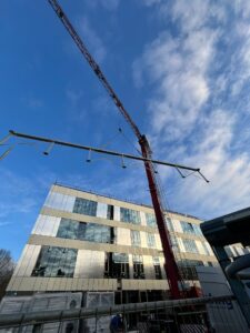 Op dit moment zijn alle gevels dicht en is het gebouw wind- en waterdicht. Intussen is er ook al gestart met de afbouw en het plaatsen van de binnenwanden. De lokalen worden nu dus echt zichtbaar.