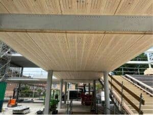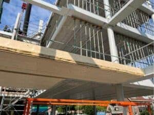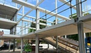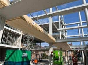 Deze maand zijn o.a. de kanaalplaatvloeren gelegd. Deze houten vloeren zijn bijzonder, omdat ze van hernieuwbaar hout gemaakt zijn. Ze zijn lichtgewicht, slaan CO2 op en zijn makkelijk te monteren. En het hoeft verder ook niet afgewerkt te worden, het is namelijk vloer en plafond in één. Een mooie en duurzame oplossing, naast al het beton wat natuurlijk ook nodig is.